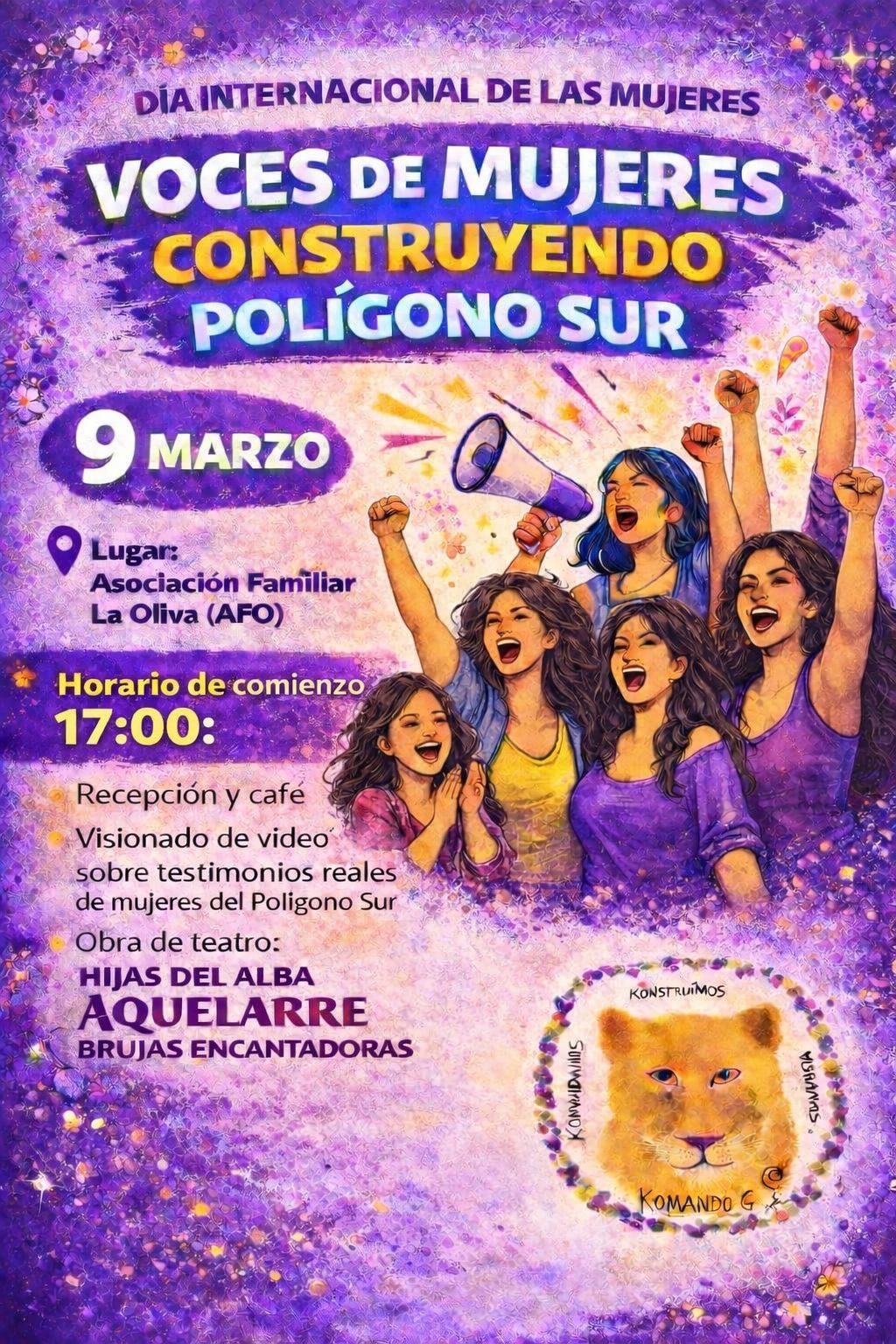 Este año el lema es :"Voces de Mujeres Construyendo Polígono Sur" y se celebra el próximo día 9 de Marzo en la Asociación Familiar de La Oliva.