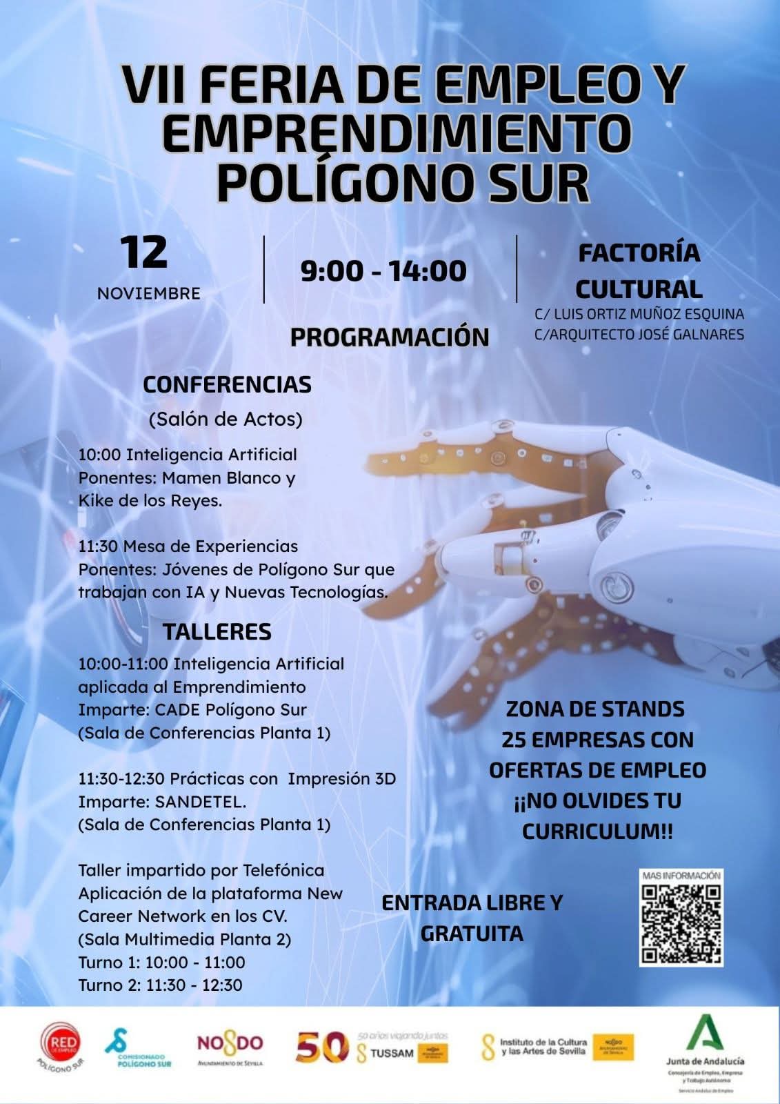 Os dejamos el programa de la VII feria de empleo y emprendimiento que se celebrará el día 12 de Noviembre en Factoría Cultural sito en la calle Luis Ortiz muñoz s/n. La entrada es libre y gratuita y esta edición trata sobre Inteligencia Artificial.